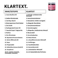 Kokosöl: antibakterieller Wirkstoff, Geruchsneutralisierer, Maisstärke: erhöht Cremigkeit, pflegende Shea Butter, Geruchsneutralisierer, Konsistenzgeber, pflegendes, fraktioniertes Kokosöl, Blumenduft, Geruchsabsorber, Nässe Schutz, schweißhemmender Wirkstoff, Verflu-ssiger, Feuchthaltemittel, Sonnenblumenöl, antioxidativer Wirkstoff, Bestandteile des Parfumes