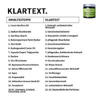 Kokosöl: antibakterieller Wirkstoff, Geruchsneutralisierer, Maisstärke: erhöht Cremigkeit, pflegende Shea Butter, Geruchsneutralisierer, Konsistenzgeber, pflegendes, fraktioniertes Kokosöl, Kardamom & Mimose, Geruchsabsorber, Nässe-Schutz, schweißhemmender Wirkstoff, Verflu-ssiger, Feuchthaltemittel, Sonnenblumenöl, antioxidativer Wirkstoff, Bestandteile des Parfumes