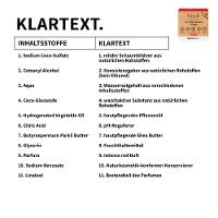 milder Schaumbildner aus natu-rlichen Rohstoffen, Konsistenzgeber aus natu-rlichen Rohstoffen (kein Ethanol), Wasserrestgehalt aus verschiedenen Inhaltsstoffen, waschaktive Substanz aus natu-rlichen Rohstoffen, hautpflegendes Pflanzenöl, pH-Regulierer, hautpflegende Shea Butter, Feuchthaltemittel, Intense red Duft, Naturkosmetik-konformer Konservierer, Bestandteil des Parfumes