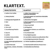 milder Schaumbildner aus natu-rlichen Rohstoffen, Konsistenzgeber aus natu-rlichen Rohstoffen (kein Ethanol), pflanzlicher Glanzgeber, Wasserrestgehalt aus verschiedenen Inhaltsstoffen, Green touch Duft, pH-Regulierer, waschaktive Substanz aus natu-rlichen Rohstoffen, Feuchthaltemittel, Feuchtigkeitsspender, waschaktive Substanz aus pflanzlichen Ölen, feuchtigkeitsspendendes Pflanzenöl, Teil der Guarpflanze (Conditioner), Naturkosmetik-konformer Konservierer, Bestandteile des Parfumes