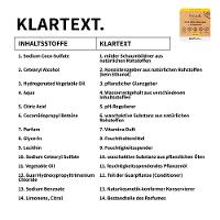 milder Schaumbildner aus natu-rlichen Rohstoffen, Konsistenzgeber aus natu-rlichen Rohstoffen (kein Ethanol), pflanzlicher Glanzgeber, Wasserrestgehalt aus verschiedenen Inhaltsstoffen, pH-Regulierer, waschaktive Substanz aus natu-rlichen Rohstoffen, Vitamina Duft, Feuchthaltemittel, Feuchtigkeitsspender, waschaktive Substanz aus pflanzlichen Ölen, feuchtigkeitsspendendes Pflanzenöl, Teil der Guarpflanze (Conditioner), Naturkosmetik-konformer Konservierer, Bestandteile des Parfumes