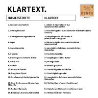 milder Schaumbildner aus natu-rlichen Rohstoffen, Konsistenzgeber aus natu-rlichen Rohstoffen (kein Ethanol), hautpflegendes Pflanzenöl & pflanzlicher Glanzgeber, Wasserrestgehalt aus verschiedenen Inhaltsstoffen, waschaktive Substanz aus natu-rlichen Rohstoffen, Feuchthaltemittel, hautpflegende Shea Butter, pH-Regulierer, Athletic grey Duft, hautreinigende Aktivkohle, Feuchtigkeitsspender, waschaktive Substanz aus natu-rlichen Rohstoffen, Teil der Guarpflanze (Conditioner), Naturkosmetik-konformer Konservierer, Bestandteile des Parfumes