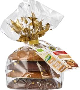 (Kakaomasse*, Rohrzucker*, Kakaobutter*, Bourbon-Vanille-Extrakt*), Gewürze*, Backtriebmittel: Ammoniumhydrogencarbonat; Backoblaten* (WEIZENMEHL*, Stärke*)
