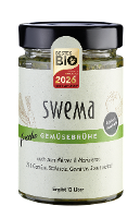 SweMa Frische Gemüsebrühe mit 73% rohem Gemüse, Steinsalz, Gewürze. Sonst nichts!Eine gesunde, natürliche und besonders leckereAlternative zu Brühwürfeln, Brühpulvern undallem, was Sie bisher kennen! Geeignet auchzum Marinieren, für Dressings, zum Würzen undzu vielem mehr!Zubereitungsempfehlung:Einen gehäuften TL (13 g) mit 500 mlkochendem Wasser aufgießen.Für einen kräftigeren Geschmack kurz in Öl anbraten.Zutaten: 73 % rohes Bio-Gemüse  (Pastinake, SELLERIE, Karotte, Lauch, Zwiebel, Petersilie, getrocknete Tomate), Steinsalz (ohne Rieselhilfe), Bio-Gewürze.Zusatzstoffe, auch die im BIO-Bereich zugelassenen, verwenden wir nicht! Regionalität und Natürlichkeit bedeutet für uns mehr als nur ein Trend. Die Achtung für Lebensmittel und deren Erzeuger spielt in unseren jungen Unternehmen eine der wichtigsten Rollen.Was unterscheidet uns von anderen Gemüsebrühen- Unser Produkt ist nicht getrocknet, wir verwenden rohes, frisches Gemüse, Salz und Gewürze- der Gemüseanteil beträgt 73 %- Wir verwenden keinerlei Zusatzstoffe, auch keine im BIO-Bereich zugelassenen- Wir verzichten auf die Verwendung aller Bestandteile, welche nicht in eine Gemüsebrühe gehören (Maltodextrin, Maisstärke, zugesetzter Zucker, Hefeextrakt uvm.)- keine zugesetzten Fette oder Öle - selbstverständlich in bester Bio Qualität- das Suppengrün im GlasInformation zum Mindesthaltbarkeitsdatum: Nach der Herstellung ist die Gemüsepaste mindestens 9 Monate haltbar. Wir empfehlen die ungeöffneten Gläser im Trockenregal oder im Trockenlager zu lagern. Für geöffnete Gläser empfehlen wir die Lagerung im Kühlschrank. Die Kühllagerung dient ausschließlich der Farbstabilisierung. Nach 9 Monaten verändert sich aufgrund dessen, dass wir keine Antioxidationsmittel verwenden, leicht die Farbe durch den Abbau vom Chlorophyll (Grüne Farbe im Gemüse), was unbedenklich für die Verzehrbarkeit ist. Das deutsche Lebensmittelrecht gibt allerding vor, dass das Mindesthaltbarkeitsdatum erreicht ist sobald sich u.a. die Qualitätsbeschreibenden Merkmale (z.B. Farbe) verändern. Die von uns angegebenen 9 Monate beziehen sich daher nur auf die Farbveränderung, nicht auf die eigentliche Haltbarkeit. Die Gemüsebrühe kann aufgrund des zugegebenen Salzes mikrobiologisch nicht verderben und kann daher auch weit nach dem Ablauf des MHD's verwendet werden.www.swema-lebensmittel.de